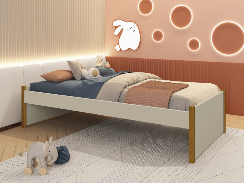 A Cama Evolutiva Ravi é uma opção 2 em 1, nas versões Montessoriana e Turca, projetada para acompanhar o crescimento do bebê. Com cantos arredondados e pés em madeira Pinus, ela oferece um ambiente seguro e confortável. A versão Montessoriana é ideal para a transição após o berço, garantindo segurança para a criança e praticidade para os pais. O colchão recomendado é 188×88 cm. Os kits de proteção, disponíveis em versões lisas ou vazadas na cor Branco Fosco, são vendidos separadamente.