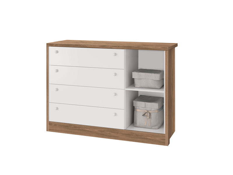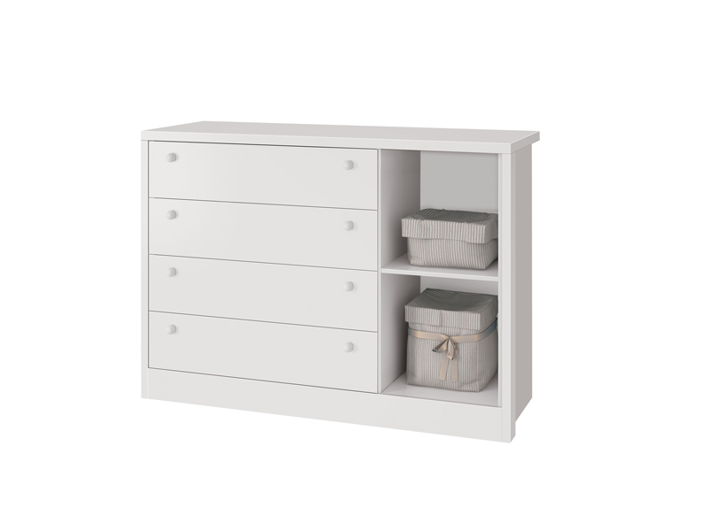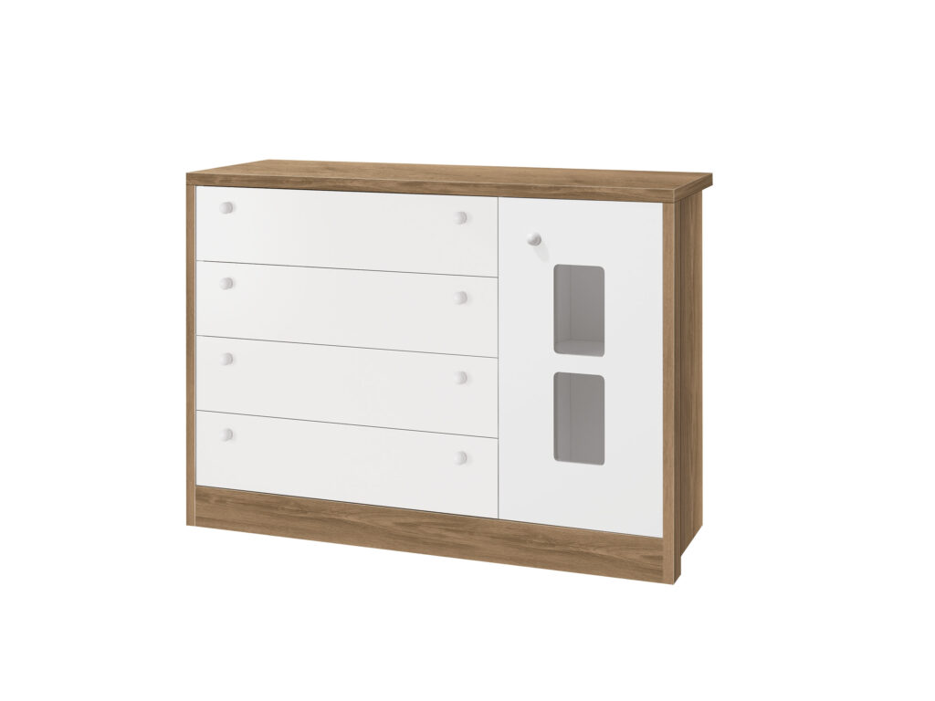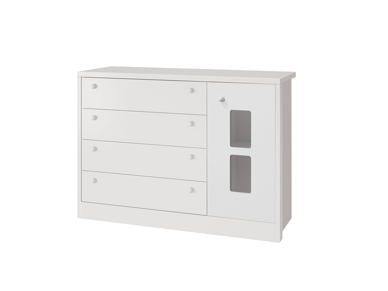 A Cômoda Joãozinho combina funcionalidade e segurança com um design atraente em branco brilho e fosco. Composta por quatro gavetas espaçosas e uma porta com detalhe em acrílico, ela é ideal para organizar roupas e acessórios, além de possuir uma prateleira interna para melhor disposição dos itens. As corrediças telescópicas permitem um deslizar suave das gavetas, enquanto os puxadores de PVC garantem praticidade no uso. O acabamento UV atóxico agrega resistência e durabilidade.