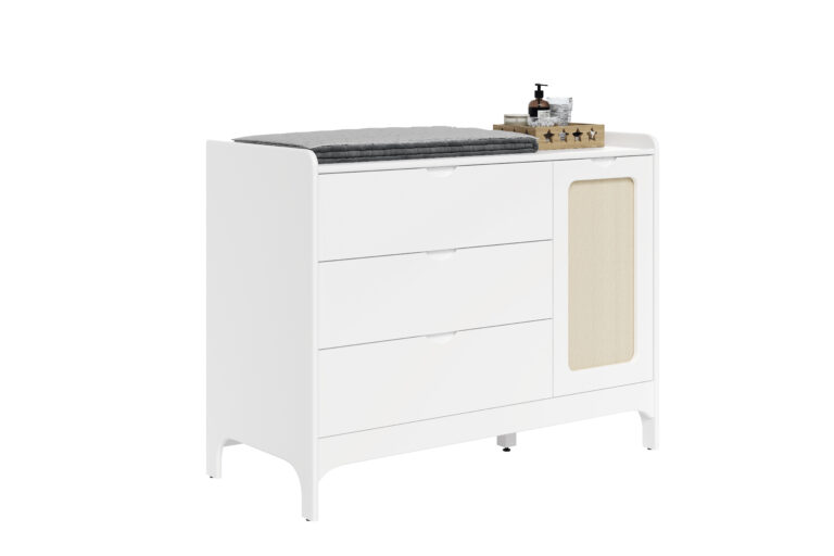 A Cômoda Sap. Brisa 1P3G combina praticidade e estilo para o quarto do seu bebê. Com três gavetas equipadas com corrediças telescópicas, oferece espaço amplo e organizado para armazenar itens do bebê. A porta com telas adiciona um toque delicado ao design, além de ser funcional para guardar itens maiores. O tampo pode ser usado como base para o trocador, proporcionando maior comodidade durante a troca de fraldas. Seu acabamento sem parafusos expostos e os puxadores embutidos garantem um visual clean e moderno.